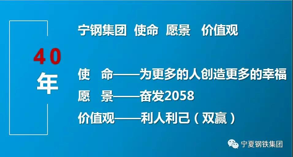 董事長曹廣江說:集團(tuán)今天的發(fā)展,自己真是集萬千寵愛于一身。寧夏紅是寧夏人的寧夏紅,寧鋼是寧夏人的寧鋼。寧鋼集團(tuán)發(fā)展的這60年,不是我一個人干出來的,是寧鋼集團(tuán)三千兄弟姐妹們一起干出來的;寧鋼的歷史文化,不是我說出來的,是寧鋼人一步一步走到今天沉淀下來的。創(chuàng)業(yè)的路很艱辛,每天都在奔跑,真是九死一生才有了今天!我就是想讓寧鋼人都過的幸福,能自豪的說——我是寧鋼人!