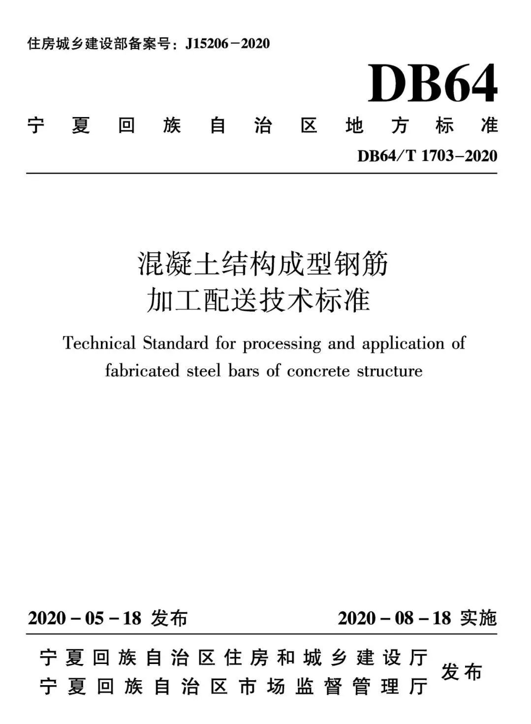 日前,經(jīng)由國(guó)家住房和城鄉(xiāng)建設(shè)部備案,寧夏回族自治區(qū)住房和城鄉(xiāng)建設(shè)廳、寧夏回族自治區(qū)市場(chǎng)監(jiān)督管理廳聯(lián)合發(fā)布,由寧夏鳳凰城智能制造有限公司主編的《混凝土結(jié)構(gòu)成型鋼筋加工配送技術(shù)標(biāo)準(zhǔn)》(J15206-2020,DB64/T 1703—2020)正式出版發(fā)行,于2020年8月18日起正式實(shí)施。